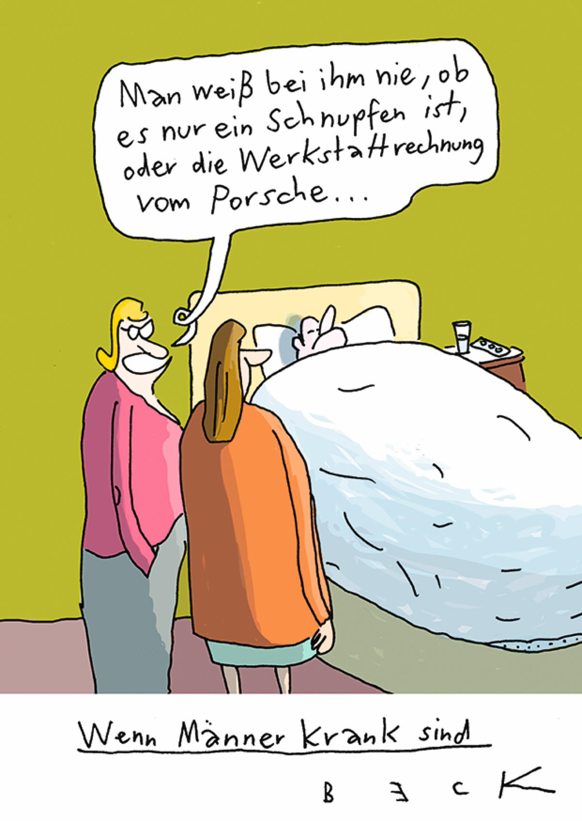 Zwei Frauen unterhalten sich besorgt über einen Mann, der im Bett liegt. Der Humor zeigt den typischen Umgang mit Krankheiten bei Männern.